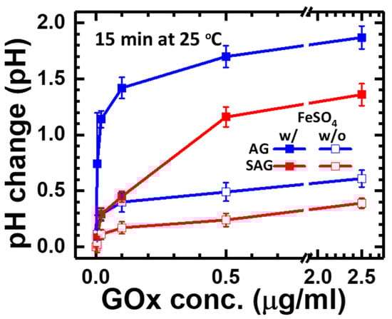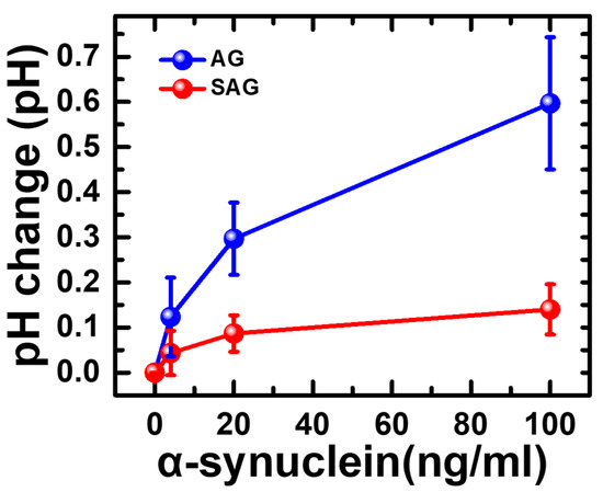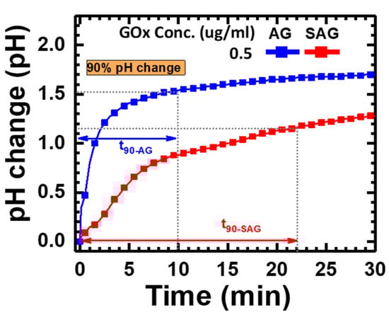 To verify the real response of pH changes generated by the reaction between GOx and glucose, pH measurements were performed continuously for 30 min. The time-dependent response of pH changes can be collected to define a reliable reaction time. As shown in Figure 3, the gradual pH increases with time and can be clearly seen in two different species—avidin- or streptavidin-conjugated GOx (abbreviated as “AG” or “SAG” in Figure 3, respectively). The pH change of the AG group was faster and higher than that of the SAG group. The response time, calculated as the time for 90% of the total response, was approximately 10 and 22 min for the AG and SAG groups, respectively. To have an acceptable response time to compare both reactions, 15 min (e.g., average value between two reactions) was selected as a fixed response time to check the pH changes for the following experimental groups.
