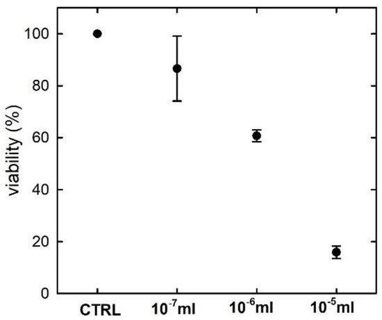 Results of average viability and standard deviation values of CaCo-2 cells exposed for 24 h to different concentrations of a commercial pesticide with Deltamethrin as active ingredient. The values reported on the horizontal axis refer to the volume of pesticide inside 1 mL of medium. The viability values have been obtained according to the MTT assay.