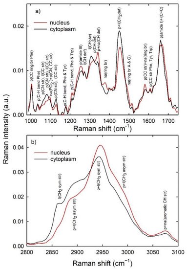 Average normalized Raman spectra from the cytoplasm (black lines) and nucleus (red lines) regions of control CaCo-2 cells in the 980–1750 cm−1 (a) and 2800–3100 cm−1 (b) spectral range. The attributions of the main spectral features are labeled [31]. Abbreviations: p: proteins; l: lipids; na: nucleic acids; br: breathing mode; str: stretching; bend: bending; tw: twisting; def: deformations; sym: symmetric; asym: asymmetric; Phe: phenylalanine; Tyr: tyrosine; Trp: tryptophan; A: adenine; G: guanine.