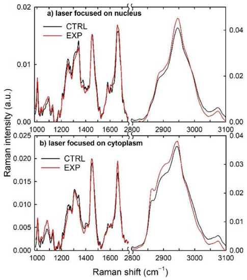 The Raman spectra of cells from the same cellular type can be slightly different because of the heterogeneity of the subcellular compartments from which the signal is measured. Therefore, the average spectra measured from many control and exposed cells should primarily be compared with each other to investigate the modifications of a cellular structure and biochemical composition as a consequence of a chemical stress. In order to discriminate signals due to different cellular components, we acquired two Raman spectra for each cell by focusing the laser beam firstly inside the nucleus and then inside the cytoplasm. In the former case, we measured the Raman signals mainly from the nucleus components (nucleic acids, DNA/RNA and proteins) and, to a lesser extent, plasmatic membrane components (mainly proteins and lipids); in the latter case, the nucleus components are excluded from the sampled volume. In this way, the comparison of the average spectra of the control and exposed cells can allow to investigate separately the similarities and differences in the nucleus and cytoplasm compartments.