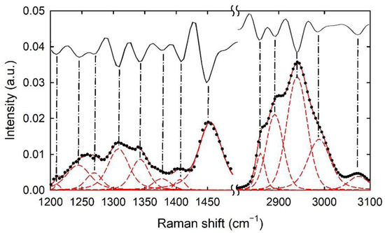 In order to estimate the above intensity ratios, we achieved a deconvolution analysis of each measured spectrum in the spectral range, including the above Raman peaks, as shown in Figure 4, for the Raman spectrum collected from the cytoplasm region of a typical control CaCo-2 cell. In particular, each spectrum was fitted by means of Voigt functions, consisting of overlapped Gaussian and Lorentzian functions [39,40]. For each fitting procedure, the spectral positions of the fitting functions were fixed, according to the minima of the second derivative function of the experimental spectrum. Such a step was performed in order to minimize the fitting parameters and to make the fit as reliable as possible. Fitting procedures by means of Voigt functions have been reported by G. Pezzotti as a very useful tool for the deconvolution of Raman spectra in cell biology and microbiology [21]. However, other functions, such as Lorentzian [41] and Gaussian [42] ones, have been reported. We used Voigt functions because they better fit the Raman spectra than Lorentzian and Gaussian functions.