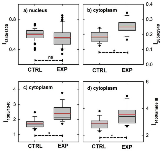 Box plots reporting the comparison of the area ratios for selected peaks, related to different cellular components, in the normalized Raman spectra of control and exposed CaCo-2 cells. In (a), the ratio between the area of the peak centered at about 1340 cm−1 (related to CH deformation of protein and nucleic acid components) with respect to the area of the peak at 1320 cm−1 (related to protein components) for spectra from nucleus region is reported; in (b), the ratio between the areas of the peak centered at about 2858 cm−1 (related to lipid components) with respect to the area of the peak at 2940 cm−1 (related to both protein and lipid components) for spectra from cytoplasm region is shown; in (c), the ratio between the area of the peak centered at about 1305 cm−1 (related to lipid components) with respect to the area of the peak at 1340 cm−1 (related to protein components) for spectra from cytoplasm region is displayed; in (d), the ratio between the area of the peak centered at about 1450 cm−1 (related to both lipid and protein components) with respect to the area of the peak of amide III at about 1260 cm−1 (related to protein components) for spectra from cytoplasm region appears. Mean and median values are shown with red and black lines, respectively, inside each box. Whiskers correspond to 5th and 95th percentiles and black dots correspond to outliers. The statistically significant differences among each group of cells (dashed lines, ns indicating not significant, while * indicating statistical significance with p < 0.001) were estimated by means of Anova test.