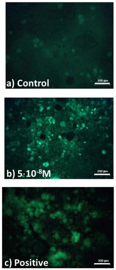 To try to get more insight about lipids modifications in exposed cells with respect to control ones, we performed an assessment of the lipid content inside CaCo-2 cells by means of fluorescence images, after the cells’ exposure to the pesticide with the investigated concentration. In particular, we obtained fluorescence images by using the fluorophore BODIPY (D-3922), which is targeted to quantify neutral lipids and lipid droplets content. From typical fluorescence images, shown in Figure 6, it can be deduced that the fluorescence increases from the control (Figure 6a) to the 5 × 10−8 M exposed (Figure 6b) cells, because of the increase in neutral lipid synthesis. In particular, the fluorescence intensity from the exposed cells is similar to that from oleic acid exposed cells (Figure 6c). Oleic acid usually serves as a positive control for increased neutral lipid content because it is known to be an inducer of triglyceride synthesis and storage [43].