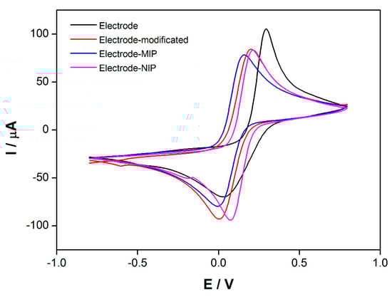 Characterization by CV of screen-printed gold electrodes in solution of 2 mM K3[Fe(CN)6] in H2SO4. Bare gold electrode (black), 6-mercaptohexanol-modified gold electrode (red), NIP-electrode (pink), and MIP-electrode (blue).