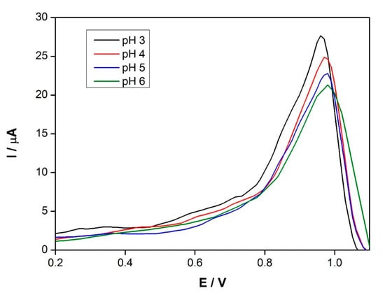 After electrochemical characterization of modified electrodes, we analyzed the enrofloxacin response on the non-modified electrodes. For this, square wave voltammetry was used as the electroanalytical technique for enrofloxacin determination. The analysis was performed to evaluate the influence of pH to obtain the best enrofloxacin peak with sufficient current response for further quantitative analysis. The buffers used were in the pH range from 3 to 6. Figure 4 shows that as the pH value of the solution increases, the oxidation peak corresponding to the EF decreases. The maximum current intensity peak and a shift in the window potential occurs for each pH of the solution. These results correspond to the ones reported by Hernandez et al., 2021 []. The characteristic peak of oxidation of enrofloxacin appears at 0.9 V, corresponding to the peak shown in the solution with pH 3. Based on these results, we decided that the optimal working conditions for further experiments were at pH 3. The following study consisted in obtaining a calibration curve of the current response versus EF concentrations. Figure 5 shows a linearity current peak proportional to EF concentrations with a coefficient of determination (R2) of 0.9947. This study is important to understand the nature of the chemical and physical processes involved in the electroanalytical procedure.