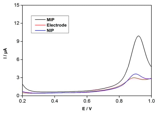 To compare the electrochemical response of the modified electrode with the molecularly imprinted enrofloxacin, SWV analysis was performed for the MIP, NIP, and bare electrodes in the presence of enrofloxacin. Figure 6 shows the well-defined oxidation peak of enrofloxacin at the window potential of 0.9 v for the electrode modified with MIP. It was also observed in the current peak shown in Figure 5 at a concentration of 1 mM. Likewise, a small oxidation peak was observed for the NIP control electrode attributed to non-specific interactions or small unmodified areas in the electrode, which was also observed for the bare electrode presenting a small signal corresponding to the oxidation of enrofloxacin at pH 3, as shown in Figure 4. However, when compared with the corresponding signal from the MIP-electrode, the current peak is much higher due to the modification of the electrodes with the MIPs, concentrating in a greater proportion the analyte sample in the cavities of the MIP polymer, as also reported by Seguro et al., 2022 []. Therefore, this system may be used for the detection of enrofloxacin.
