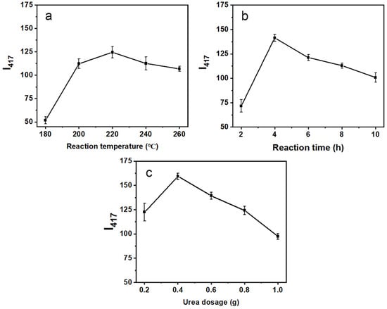 Variations in the emission intensities at 417 nm of the N-CQD solutions (80 mg/L) under different reaction temperatures (a) 2–10 h, reaction times (b) 180–260 °C, and urea dosages (c) 0.2–0.6 g.