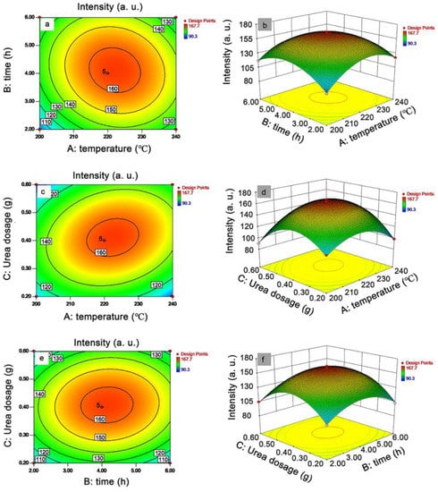 Contour plot and 3D response surface between each factor (A = temperature, B = time, C = urea dosage) and the intensity at 417 nm of the N-CQD solutions: contour plot and 3D response surface between A and B (a,b), A and C (c,d), B and C (e,f).