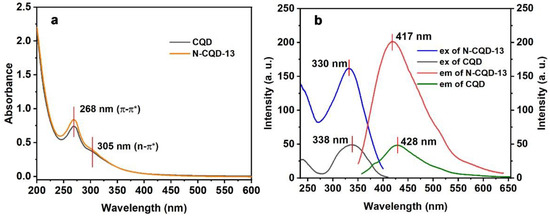 Subsequently, the UV-Vis absorption and fluorescence spectra (excitation and emission) of the CQD and N-CQD-13 solutions were studied (Figure 4 and Table 7) The maximum absorption wavelengths (λmax) of CQD and N-CQD-13 solutions were 268 nm, which could be associated with the π-π* transition in the sp2 domains of the aromatic structure [58]. A side peak at 305 nm was found as the n-π* transition of the C=O bond [59]. In the fluorescence spectra, the maximum excitation wavelength (λex) and emission wavelength (λem) of N-CQD-13 (λex = 330 nm, λem = 417 nm) exhibited a slightly hypochromatic shift compared to CQD (λex = 338 nm, λem = 428 nm). The general excitation wavelength λex = 330 nm and emission wavelength λem = 417 nm were chosen in the further experiments of N-CQD-13. The Stokes shifts of CQD and N-CQD-13 were 90 nm and 85 nm, respectively.