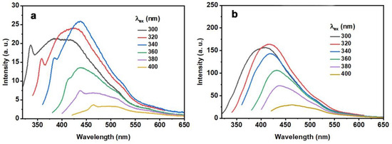 The fluorescence emission spectra of CQD and N-CQD-13 exhibited excitation-dependent behaviors (Figure 5, Table 8), which is general in fluorescent carbon materials [48]. When excited by various excitation wavelengths, the emission wavelengths displayed a bathochromic shift upon increasing the excitation wavelengths. For CQD, the intensity enhanced up to 340 nm and decreased at longer excitation wavelengths. A similar trend was found in N-CQD-13, which exhibited a maximum intensity at λex = 320 nm. Additionally, the emission intensity of N-CQD-13 was stronger than that of CQD when excited at the same excitation wavelength, revealing that the nitrogen-doped modification could enhance the optical property to some degree. Quantum yields of CQD and N-CQD-13 were also investigated (Table 6). The absolute and relative QY of N-CQD-13 were 1.69% and 12.2%, respectively, which were higher than CQD (0.53% for absolute QY and 2.56% for relative QY). Hence, N-CQD-13 was chosen as the more proper probe in further application studies.