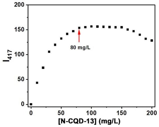 To confirm whether the intensity of N-CQD-13 was concentration-dependent, the emission intensities of different concentrations of N-CQD-13 aqueous solutions were investigated. As shown in Figure 6, the intensities enhanced along with the increment of concentrations of N-CQD-13 below 80 mg/L, and reached a plateau till the concentration of 160 mg/L. Intensities began to decrease when the concentrations were above 160 mg/L. At high concentrations, absorbers can absorb the excitation or emission light of fluorophores, inducing the inner filter effect (IFE) [60]. We suppose that when the concentration was above 80 mg/L, N-CQD-13 particles start to act as the absorbers, absorbing the excitation or emission light of other particles nearby, terminating the intensity enhancement [61]. With the further increase of concentrations, IFE enhances remarkably, leading to fluorescence quenching. Hence, 80 mg/L was used as the suitable concentration in further applications.