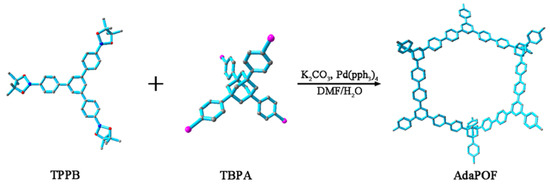 AdaPOF was prepared via Suzuki coupling reactions [25]. Briefly, TBPA (500 mg, 0.66 mmol), TPPB (603 mg, 0.88 mmol), K2CO3 (1.33 g, 9.6 mmol) and Pd(PPh3)4 (Pd ≥ 8.9%, 34.8 mg, 0.03 mmol) were added into a mixed solution of DMF (15 mL) and water (1 mL). Subsequently, the mixed solution was degassed with nitrogen protection. The solution was then heated up to 15 °C for 3 d. When the reaction was over, 200 mL of water was added into the mixed solution. The gray precipitate was obtained by filtration, and it was further washed with HCl, water, tetrahydrofuran and dichloromethane in sequence. Finally, the precipitate was collected after drying in vacuum and was named AdaPOF.