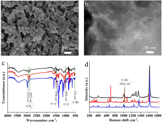 Fourier transform infrared spectroscopy (FT–IR) was performed to study the compositional and functional groups of AdaPOF. As show in Figure 2c, the peaks at 2925 and 2852 cm−1 can be assigned to –CH2– stretching vibration; the peaks obtained at 1596 and 1078 cm−1 represent the stretching vibration of the C=C on the benzene ring (curve 1). These results indicated that there were a large number of methylene and benzene rings in the AdaPOF framework. In addition, the characteristic of C-Br stretching bands (532 cm−1), only observed in the TBPA framework [27] (curve 2) with none in the frameworks of TPPA (curve 3) and AdaPOF, revealed that the AdaPOF had been successfully prepared by TBPA and TPPA. Raman spectra were used to further characterize the materials. Figure 2d showed that only TBPA had a strong Raman peak of C–Br at 1023 cm−1 [28] (curve 2), while AdaPOF (curve 1) and TPPA (curve 3) had no peak at this position. These characterizing results further proved the successful synthesis of the AdaPOF. A solid−state 13C CP/MAS NMR spectrum was also measured to investigate structural information of AdaPOF at molecular level. As showed in Figure S1, the peaks at 39.5 and 46.1 ppm were assigned to the carbon atom signal of adamantane, the peaks at 127.6 and 141.2 ppm could be ascribed to some carbon atom signals on the benzene ring of TBPA and TPPA, and the peaks at 148.8 ppm were assigned to the carbon atom signal of benzene ring connected with adamantane. The X–ray diffraction (XRD) measurement of AdaPOF only showed the broad and scattered characteristics and no obvious peaks were found (Figure S2), revealing that the as–prepared AdaPOF had an amorphous structure [29].