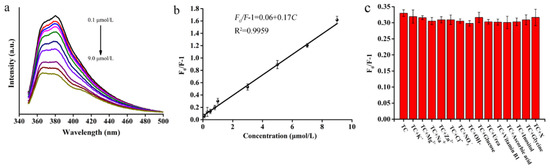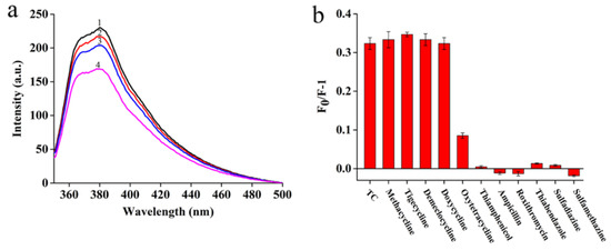 Under the optimized conditions, a series of TC solutions at different concentrations were added to the AdaPOF suspension solution, and the fluorescence emissions at 380 nm were recorded. Figure 7a shows that with the increase in the concentration of TC, the fluorescence emission intensity of the sensor at 380 nm was decreased gradually. The fluorescence emission intensity of the sensor quenched greatly when the concentration of TC was 9.0 μmol/L, with a quenching efficiency of 74%. As shown in Figure 7b, there was a good linear relationship between the F0/F-1 value and the concentration of TC in the range of 0.1 to 9.0 μmol/L. The equation of linear regression was F0/F-1 = 0.06 + 0.17C, where F0 and F represented the fluorescence intensity in the absence and presence of TC, and C represented the TC concentration. The linear dependence coefficient (R2) was 0.9959 and the limit of detection (LOD, S/N = 3) of 43 nmol/L was estimated for TC determination.