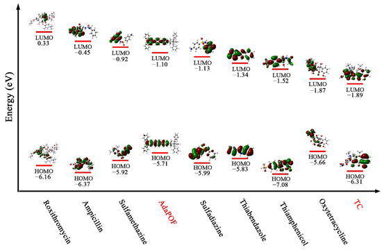 HOMO–LUMO energy profiles of AdaPOF and antibiotics.