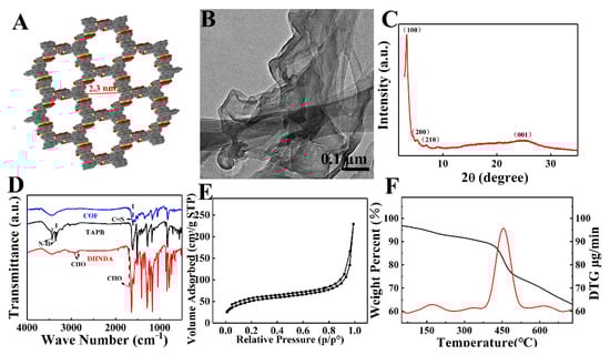 (A) The 3D structure of COFTD. (B) TEM image of COFTD. (C) XRD pattern of COFTD. (D) FTIR of COFTD, TAPB and DHNDA. (E) N2-adsorption/desorption isotherm of COFTD. (F) TGA curve of COFTD.