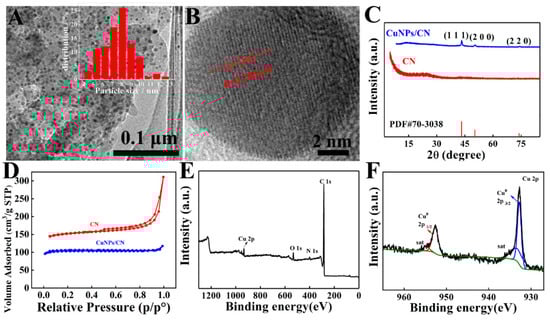 (A) TEM image of CuNPs/CN. (B) HRTEM image of CuNPs/CN. (C) XRD pattern of CuNPs/CN, CN and COFTD. (D) N2-adsorption/desorption isotherm of CuNPs/CN, CN and COFTD. (E) XPS pattern of CuNPs/CN. (F) Fine XPS spectrum of Cu 2p. Inset in Figure 2A: Particle size distribution of CuNPs.