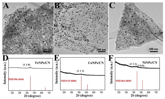 (A) TEM image of FeNPs/CN. (B) TEM image of CoNPs/CN. (C) TEM image of NiNPs/CN. (D) XRD pattern of FeNPs/CN. (E) XRD pattern of CoNPs/CN. (F) XRD pattern of NiNPs/CN.