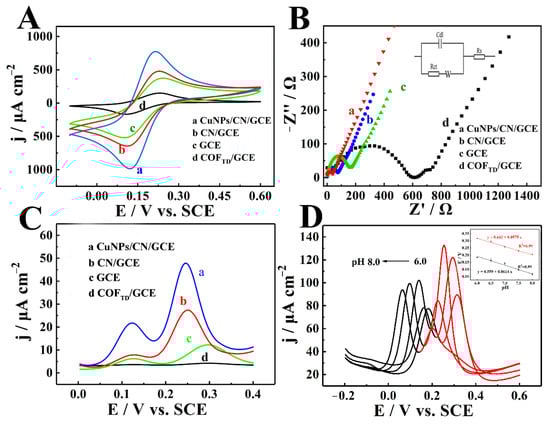 (A) CVs and (B) EIS of CuNPs/CN/GCE, CN/GCE, GCE, COFTD/GCE in 0.1 M KCl solution containing 5 mM [Fe(CN)6]3−/4− (scanning rate of 50 mV s−1 for CVs). Inset in Figure 4B Randles circuit model. (C) DPV of CuNPs/CN/GCE, CN/GCE, GCE, COFTD/GCE in 0.2 M PBS (pH = 7) containing 10 μM DA and 50 μM UA. (D) DPV of CuNPs/CN/GCE in 0.2 M N2-satruated PBS with different pH from 6.0 to 8.0 containing DA and UA (Inset: fitting curve between Ep and pH).