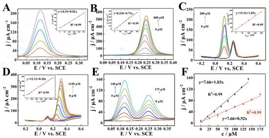 Next, CuNPs/CN/GCE was used to separately measure DA and UA. Figure 5A,B showed the DPV diagrams of DA and UA, respectively. Insets were the corresponding linear fitting diagram. With the gradual increase of DA and UA concentrations, the corresponding oxidation peak current density also gradually increased. The sensitivity of DA detection was 0.805 μA μM−1 cm−2, and the linear range was 55 nM–250 μM. The sensitivity of UA detection was 0.73 μA μM−1 cm−2, and the linear range was 62 nM–800 μM. This result indicated that CuNPs/CN could be used as a good catalytic material to construct electrochemical enzyme-free DA and AA sensors with good performances.