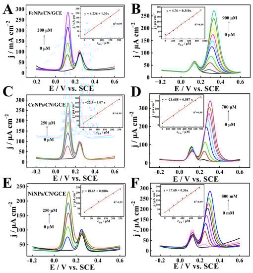 (A,C,E) DPV of FeNPs/CN/GCE, CoNPs/CN/GCE, NiNPs/CN/GCE in 0.2 M N2-statured PBS (pH = 7) containing UA to detect DA. (B,D,F) DPV of FeNPs/CN/GCE, CoNPs/CN/GCE, NiNPs/CN/GCE in 0.2 M N2-statured PBS (pH = 7) containing DA to detect UA. Insets: plots of peak current density versus concentration.