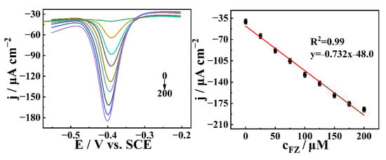 (A) DPV of CuNPs/CN/GCE in 0.2 M N2-statured PBS (pH = 7) to detect FZ. (B) Plot of peak current density and concentration.