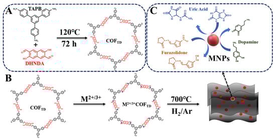 Schematic preparation of COFTD and MNPs/CN: (A) the synthesis of COFTD and (B) the synthesis of MNPs/CN. (C) The catalysis of UA, DA and FZ by MNPs/CN nanozymes.