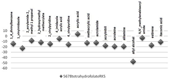 The binding energy (ΔE) was calculated using Equation (1) below. The best energy values obtained for the analyte and monomers are given in Figure 1. As can be observed, allyl alcohol exhibited the maximum interaction energy with the analyte; as a result, it was chosen as the monomer for the preparation of the MMIPs in water (solvent). Some theoretical calculations were also performed for other solvents to select the best solvent.