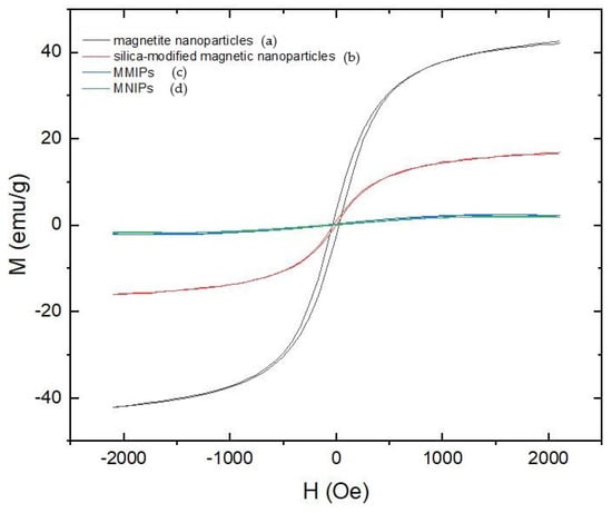 The magnetic properties of the biomimetic materials were investigated using magnetization curves (Figure 5). The results obtained showed that all the magnetic materials exhibited magnetic behavior at 300 K. Vibrating sample magnetometry (VSM) was used to study the magnetic properties of the synthesized magnetic materials, as illustrated in Figure 5. It is noticeably evident that there is no hysteresis and both the remanence and coercivity of the materials are zero; this implies that the magnetic samples investigated are superparamagnetic [31,32,40]. The decrease in magnetic behavior may be attributed to the introduction of a small particle surface effect with an inactive magnetic layer, which has a spin that shows no co-linearity with the magnetic [41,42,43]. The magnetic value of the MMIPs was found to be almost similar to that of the MNIPs though it was much smaller than that of the magnetite nanoparticles—this proved to be effective in magnetic separation.