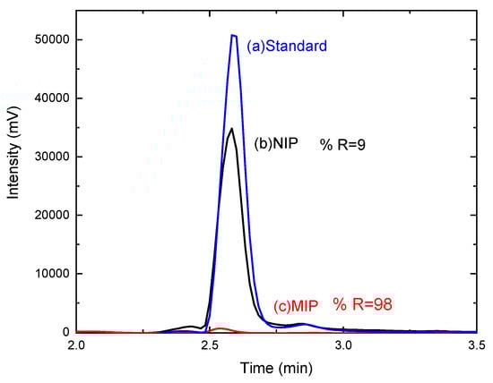 HPLC spectra obtained for the standard material (a), MMIPs after adsorption (b), and MNIPs (c). Conditions applied: methanol: phosphoric acid in the ratio of 60:40; wavelength: 280 nm.