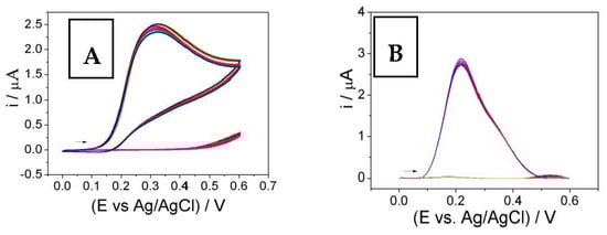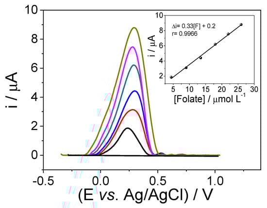 Figure 8 shows the results obtained from the application of square wave voltammetry (SWV) for the electrochemical determination of folate. The quantification of folate is carried out through successive addition in the presence of 0.1 mol L−1 acetate buffer at pH 4. In preliminary tests, Britton–Robinson buffer was tested at different pHs (2–10) and it was found that pH 4 showed a better analytical signal. When compared with acetate buffer at the same concentration, acetate buffer showed a better response and was therefore used as the buffer in the following studies. It is worth mentioning that the pre-concentration did not present significant results in the electrochemical analyzes in the presence of folate.