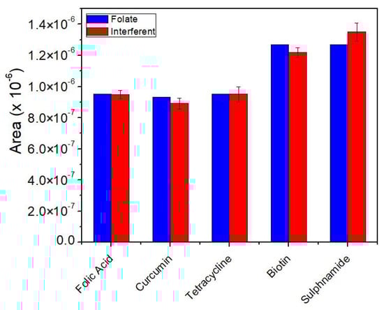The results obtained showed that the proposed sensor exhibited nearly 100% selectivity toward the detection of the analyte (folate) in the presence of other interfering compounds such as curcumin, tetracycline, biotin, and sulfonamide. The results obtained in this analysis point to the reliability of the proposed sensor when applied for the sensitive and selective determination of folate.