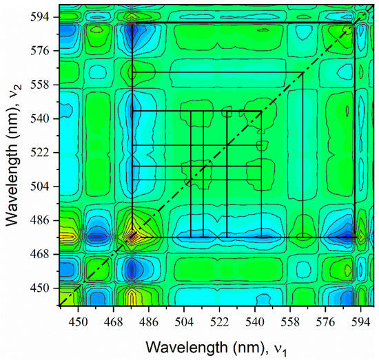 Numerous peaks were predicted by Edelstein in the region from ~450–600 nm in the Np(V) spectrum but were not assigned to experimental data [14]. These peaks were difficult to identify because they are highly convoluted, and this region has a low signal-to-noise ratio. A 2D-COS synchronous spectrum indicated numerous peaks from ~440–600 nm, and these agreed with computations (Figure 4). Cross peaks are normally identified between significant spectral features in the synchronous spectrum if the peaks truly correspond to bands in the absorption spectrum [31]. Cross peaks, located at off-diagonal positions, represent simultaneous changes of spectral intensities at two distinct spectral locations (i.e., peaks). Correlation squares joining pairs of cross peaks show coherent variation of spectral intensities at vertex locations [26]. The location of cross peaks, identified by the correlation squares, suggests that distinct peaks occur near 460, 477.5, 508, 513, 525, 543, 563, and 591.5 nm. The peaks in the synchronous spectrum were compared with the asynchronous correlation spectrum to confirm the presence of peak locations.
