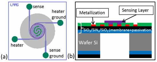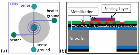 Microhotplate gas sensor with encapsulated heater and very close sensing electrodes at the surface: (a) chip top view; (b) cross-sectional view.