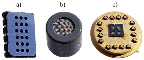 OEM sensors: (a) MiCS 2714 (5.5 × 7.5 × 2.5 mm) and (b) SP3–61 (Ø 14 mm, h 13 mm), and (c) bare TO-8 header (Ø 15.25 mm, h 1.5 mm) with self-designed multisensor silicon platform (4 nanosensors) on top.