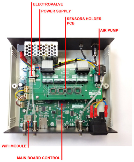 We developed and manufactured multisensor devices for measuring air pollution in real-time, each one using a different type of MOS sensor. The devices were labeled CO (commercial sensors), CS (nanosensors based on nanofibers of SnO2 or SnO2:G), and CN (nanosensors using thin films of ZnO:Ga). Sensor holder PCBs were specifically designed for each type of sensor. Each PCB could host up to 8 gas sensors of the same type and a temperature and humidity sensor (SHT21, Sensirion AG, Stäfa, Switzerland). The devices were controlled by the low-power, RISC-based, 8-bit ATMega2650 microcontroller (Microchip Technology Inc., Chandler, AZ, USA). This met the needs of the device, with features such as 256 KB of ISP flash memory, 8 KB of SRAM, 4 KB of EEPROM, 86 general-purpose I/O lines, 32 general-purpose working registers, a PWM, four USARTs, a 16-channel 10-bit A/D converter, and a JTAG interface for on-chip debugging. The device achieved a performance of 16 MIPS at 16 MHz. Readout of the sensors was performed via an external low-power 24-bit, 8-channel analog–digital converter, which allowed the acquisition of up to 15 samples per second. Three selectable bias voltages (5 V, 3.3 V, and 2.5 V) were implemented for added versatility. In addition, two measuring ranges were implemented to optimize the resolution of the measurements. These were automatically selected by the implemented program according to the measured sensor resistance. In addition, the voltage supplied to the sensor heating elements was controlled by two 12-bit, 4-channel digital-to-analog converters. In order to track the control of heaters, the current was measured with a current shunt monitor. Regarding communications, the device implements a USB port (modbus-RTU by default), Ethernet, and WiFi. Moreover, the system stores the data in a local μSD card. A real-time clock is included in the design to allow the user to know the time when there is no internet connection. With respect to the pneumatic design, the unit is equipped with an active sampling system. It includes a pneumatic pump with variable control, which produces a 0.5 L min-1 airflow to the sensors, and an electrovalve that allows the system to switch from two gas sample inlets. Moreover, a resin cell was developed to encase the sensors. The whole device was powered by a 230 VAC 50 Hz power supply. Figure 4 shows a picture of one of the devices and some key parts.