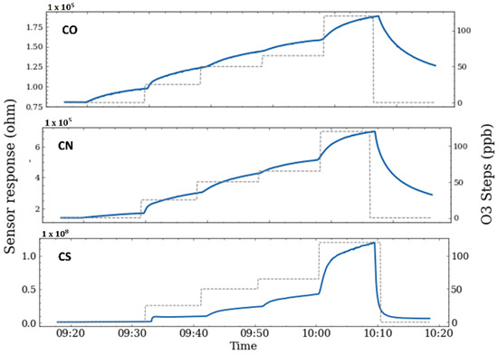 Measurements were performed in the laboratory with the multisensor devices and ozone-air mixtures from a commercial ozone source (model 714 NO2/NO/O3 Calibration Source, 2B Technologies, Boulder, CO, USA), which generates ozone by photolysis of molecular oxygen in the air. The concentration of ozone was increased from 0 ppb to 200 ppb in 5 steps of a duration of 10 min each. The measurements were repeated 3 times on different days in order to assess the sensor performance and the repeatability of the results. Figure 5 shows the results corresponding to the three devices (CO, CN, and CS). For simplicity, only one sensor of each kind is shown.