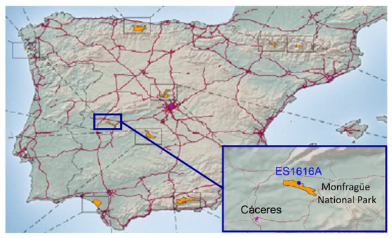 Map of the Spanish National Parks. The inset shows the air quality station (ES1616A) at Monfragüe National Park.