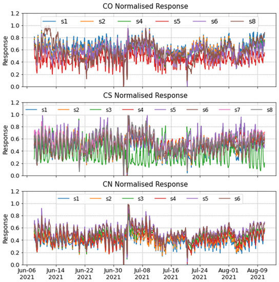 Normalized response of MOS sensors (CO, CS, and CN) during the summer campaign at Monfragüe National Park.