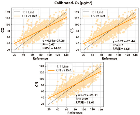 Calibration scatterplots for ozone concentration: Multisensor devices’ CO, CS, and CN vs. reference analyzer. Light orange dots represent the individual points sensor—reference, the orange line is the least squares regression line, and the black line represents the x = y line. Units are in μg·m−3.