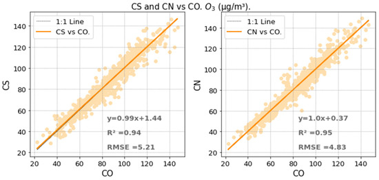 Correlation scatterplots for ozone concentration: Nanosensors CS (left) and CN (right) vs. commercial sensors CO. Units in μg∙m−3.