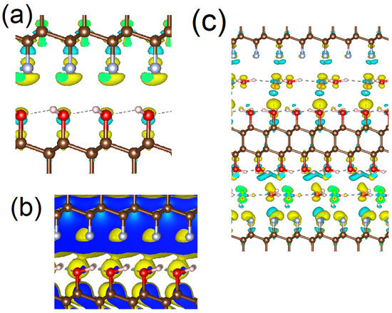Changes in charge density after formation of C2F/C2OH interface (a), the sequence charge density of conductive band minimum orbitals of C2F and C2OH in C2F/C2OH interface (b), and changes in charge density after formation of multilayered water–C2F–water–C2OH–water structure (c). Cyan and yellow clouds corresponding with decreasing and increasing charge density. The color scale of the atoms is the same as in Figure 1.