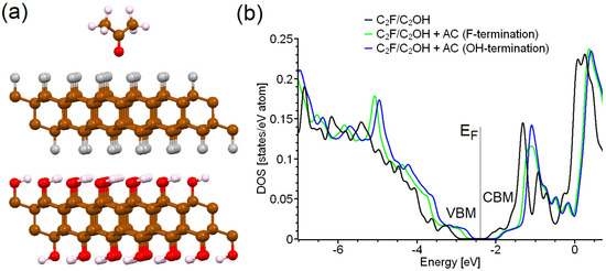 Side view of optimized atomic structure of C2F/C2OH single layer with acetone molecule physically adsorbed on F-terminated side (a), and total densities of states of the C2F/C2OH single layers before and after adsorption of acetone on different sides (terminations) (b). The color scale of the atoms in panel (a) is the same as in Figure 1.