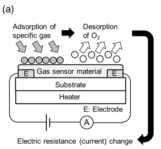 The conductometric gas sensors using CdS, CdSe, and CdTe [12,13,14,15,16,17,18,19,20,23,24,25,26,27,28,39,40,41] introduced in this review all take advantage of the fact that the electrical resistance of sensors made with these three compounds changes upon contact with gas (Table 2). Figure 1a shows a schematic diagram of the semiconductor gas sensor configuration. In air, oxygen (O2) accepts electrons from the semiconductor and chemisorbs onto the semiconductor surface in the form of anions, such as O2− and O−. When the test gas is added to the air, the test gas reacts with the adsorbed oxygen anions and donates electrons to the semiconductor, thus changing the electrical resistance of the semiconductor. Based on this principle of semiconductor gas sensors, gas sensor materials, including not only CdS, CdSe, and CdTe, but also composites of these materials with other inorganic and organic functional materials, have been investigated for their sensitivity to various gases. Furthermore, it has been reported that the gas response (electrical resistivity change ratio) and the gas sensitivity (gas response variation divided by the gas concentration variation) of gas sensor materials is greater under light irradiation than in the dark. This phenomenon is based on the effect of light irradiation on gas adsorption/desorption and the change in the electronic state of the semiconductor due to the excitation of electrons in the semiconductor by light irradiation.