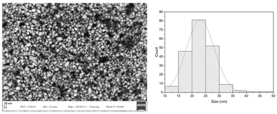 SEM image of AgNPs 11MUA at Mag = 200.00 K× (left panel). Particle size distribution (~ 23.07 ± 5.12 nm) obtained by size analysis with ImageJ software (right panel).