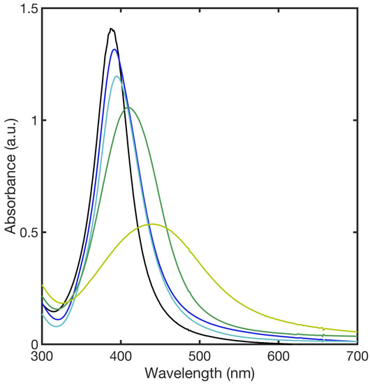 The colorless to pale-yellow change after the addition of a reducing agent to the solution containing Ag+ confirmed the formation of bare silver nanoparticles. The successful formation of AgNPs was further verified by XRD (Figure S5). The addition of a functionalizing agent caused the increase in the color intensity of the AgNP suspension. The SPAB of bare AgNPs showed a strong absorption at 392 nm, characteristic of spherical AgNPs, whereas AgNPs functionalized with different concentrations of 11MUA (Table 1) resulted in a red shift (393–440 nm) of the SPAB due to the interaction between thiol group on the surface of the NPs (Figure 2) [44,45,46].