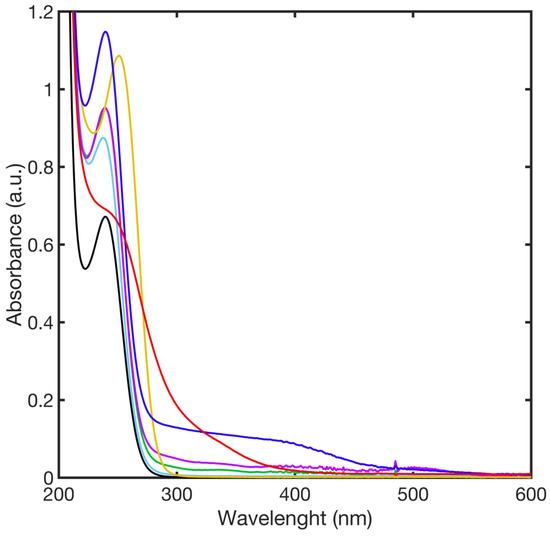 UV-Vis spectra of complexes formed upon the addition of metal ions to the 11MUA in NaOH solution; 11MUA (black line), Ni2+ (green line), Mn2+ (blue line), Cu2+ (red line), Zn2+ (cyan line), Co2+ (purple line), and Cd2+ (yellow line).