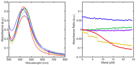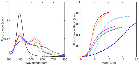 The superimposition of titration curves (Abs550/Abs414 vs metal concentration) reported in Figure 7, right panel, is representative of the sensor sensitivity to each metal.