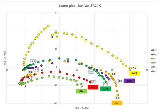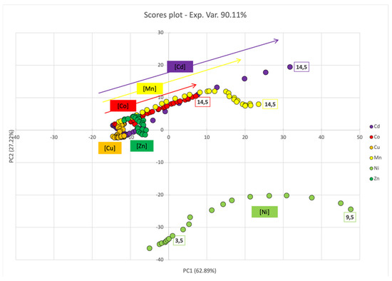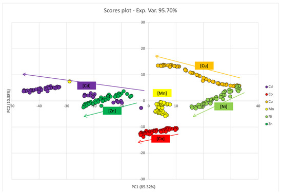 The scores plot (Figure 8) revealed no significative change in the UV-Vis spectra upon titration with Cu2+ and Zn2+. Conversely, PC1 and (only to a minor extent) PC2 score values increased with Co2+, Mn2+, and Cd2+ concentrations; this behavior was likely dependent upon the simultaneous decrease in the intensity of the SPABs characteristic of dispersed ML–AgNPs@11MUA, and the broadening of the SPABs (no well-defined second SPAB was observed). Conversely, a different trend was observed for Ni2+, since it was clearly separated alongside PC1, due to a decrease in the signal intensity of dispersed ML–AgNPS@11MUA at increasing concentrations, and alongside PC2, due to the formation of a second well-defined SPAB [13].