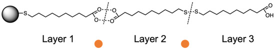 Based on this assumption, the titration of ML–AgNPs@11MUA with metal ions could promote the formation of Met2+-SH and Met2+-COOH coordination complexes and disrupt the secondary MUA–MUA interactions that stabilize the multilayer, eventually reversing the red shift of the SPAB associated with the formation of the multilayer (Figure 6) [51,52,53].